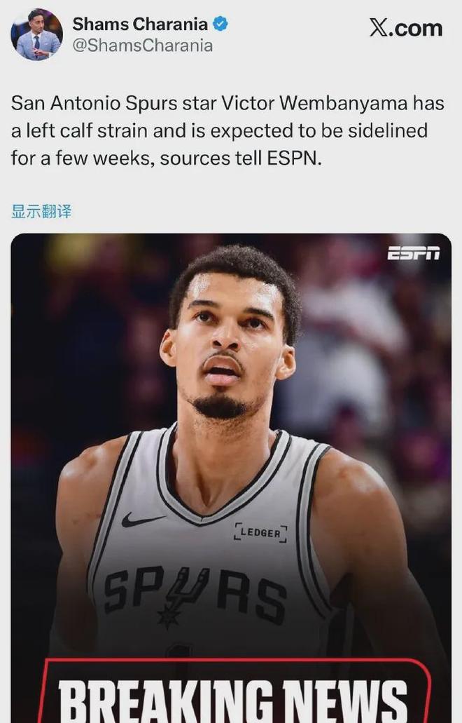 据爆料王Shams报道,文班亚马遭遇左小腿拉伤,预计将缺席数周时间。